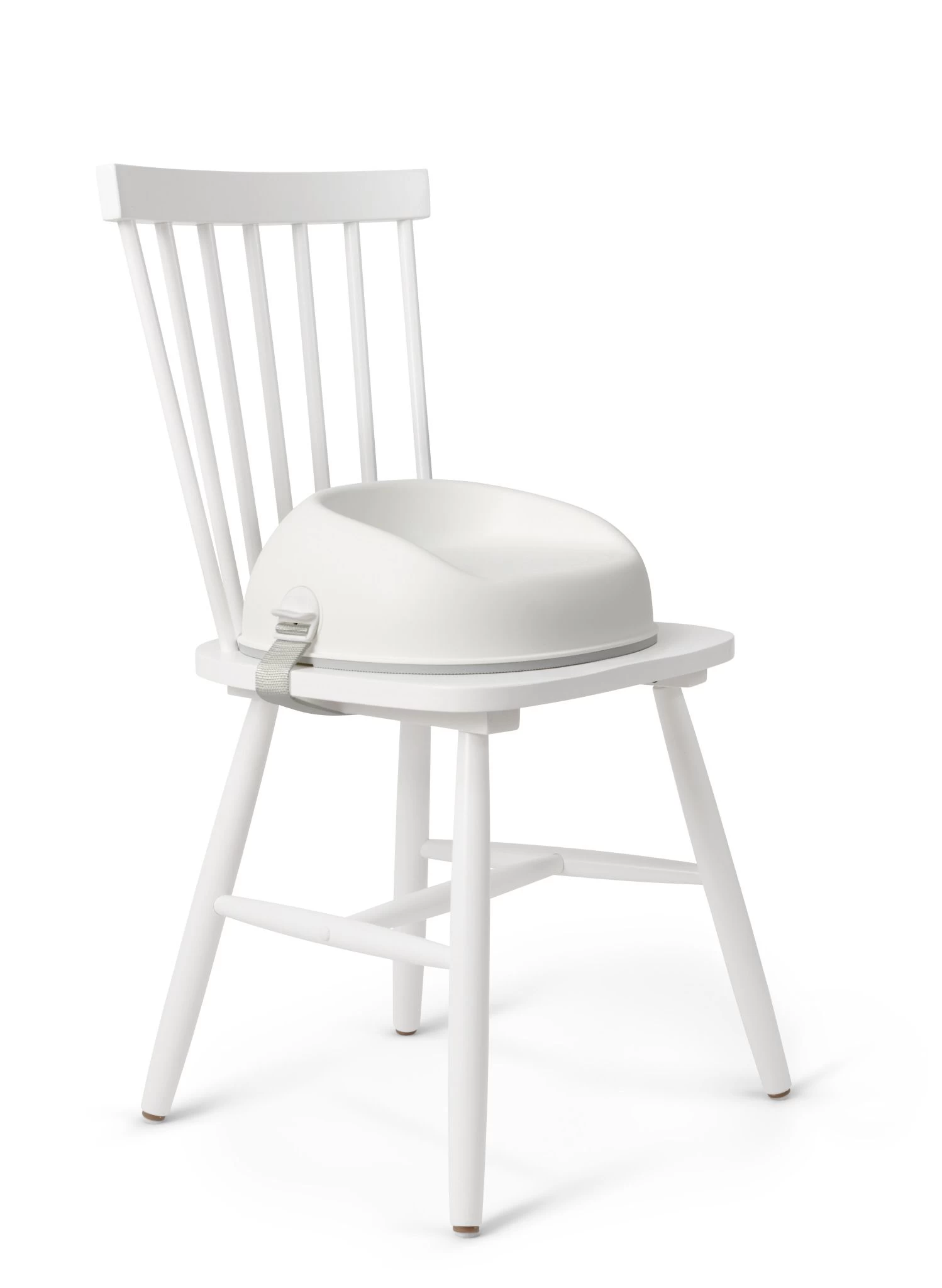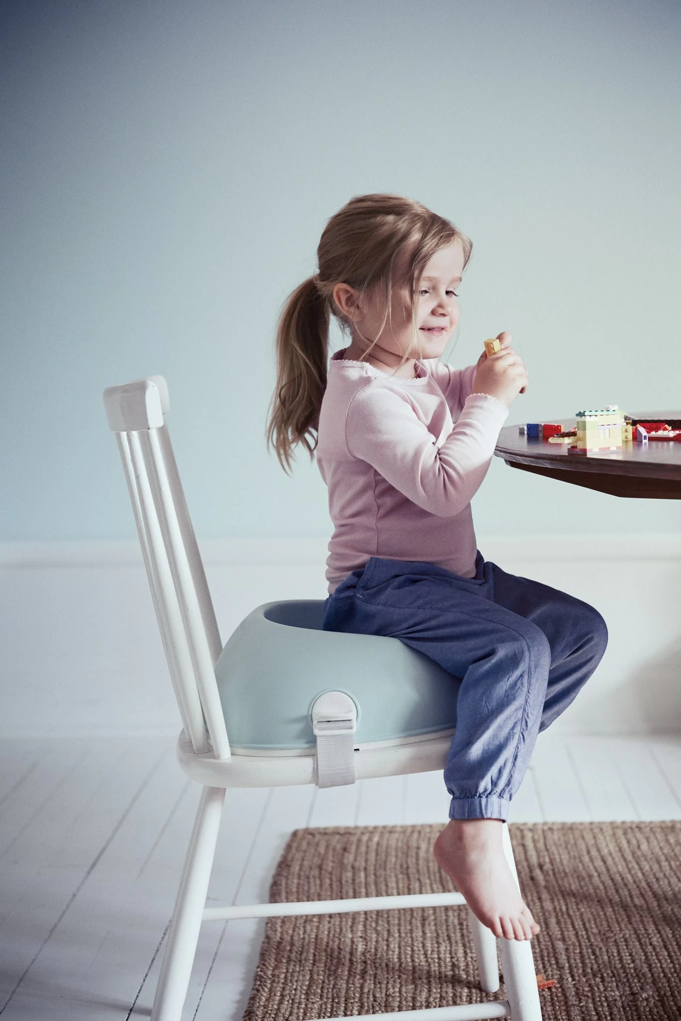 - The booster seat rests firmly on the chair and is held in place by a sturdy strap. The strap has a childproof buckle for added safety.