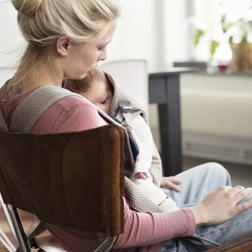 Baby Carrier Mini is perfect in the early days when your newborn baby needs a lot of closeness. You carry your baby high up on your chest, so that they always feel your heartbeat.