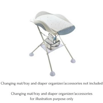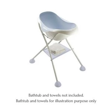 It has a modern, foldable design for space saving with four integrated non-slip feet. Includes a storage shelf for toiletries and towels. Comes with draining tube for use with Beaba bath.