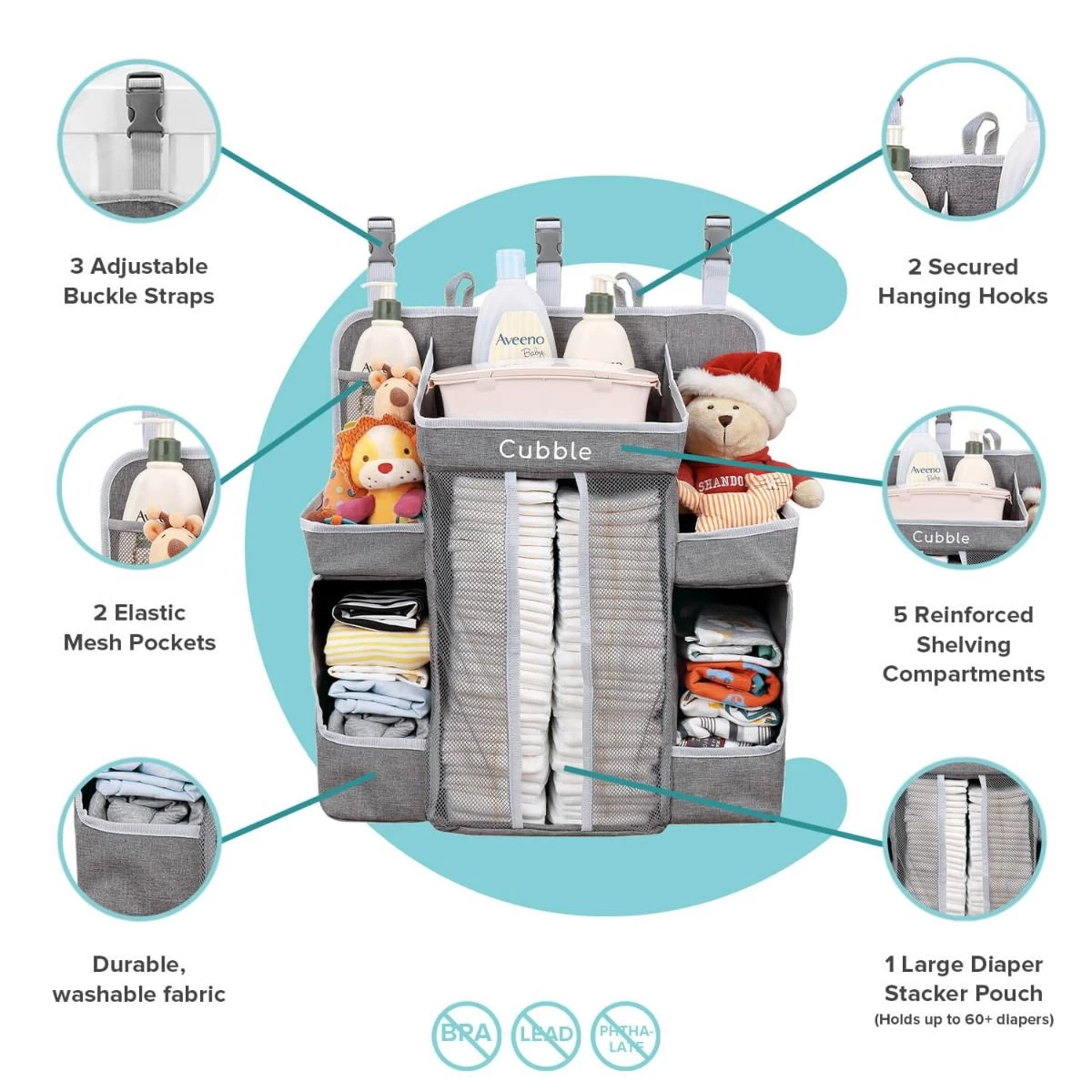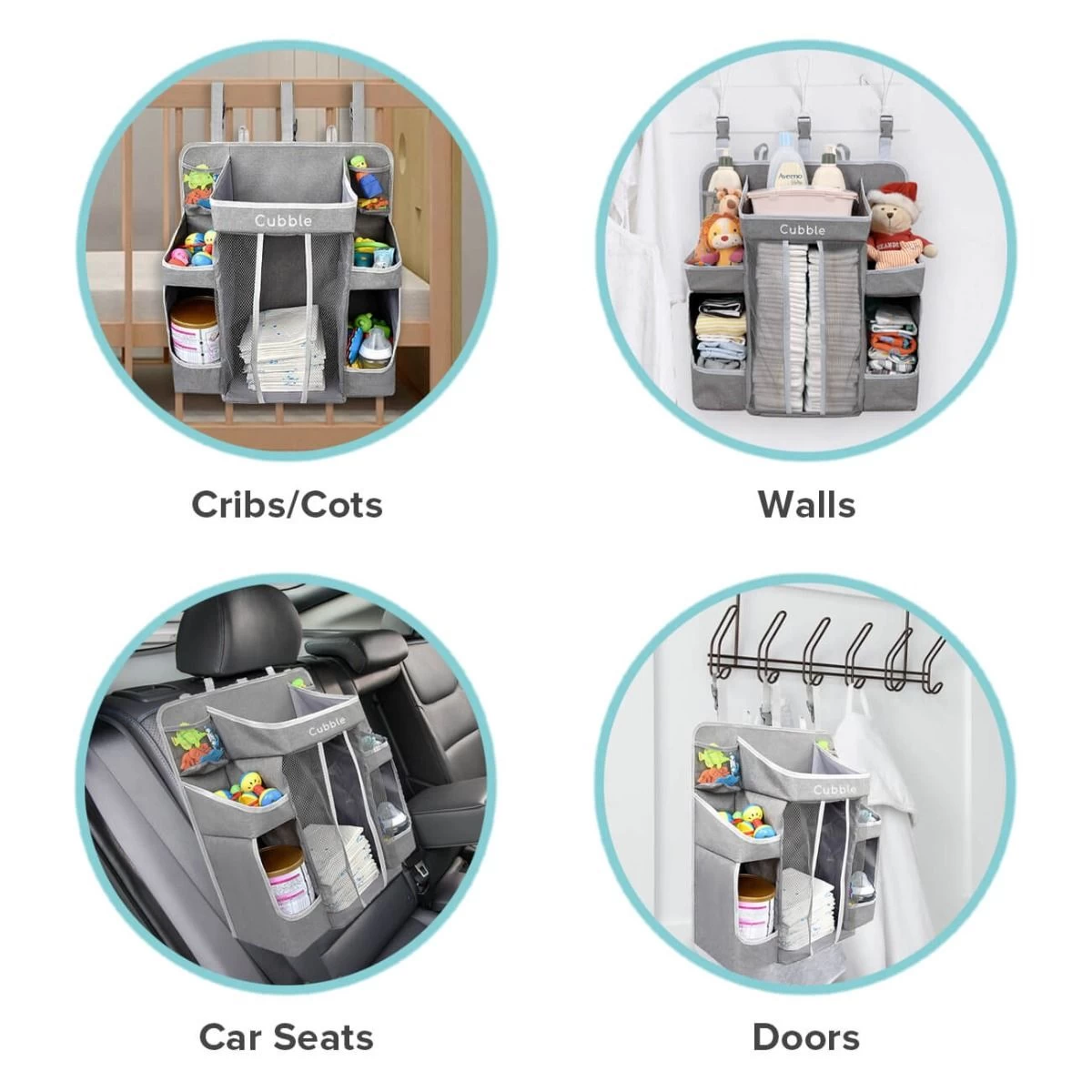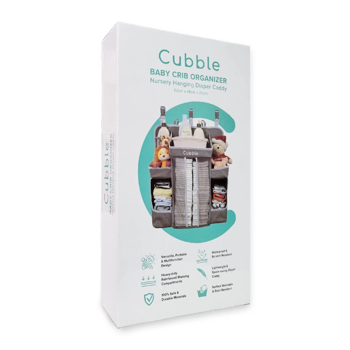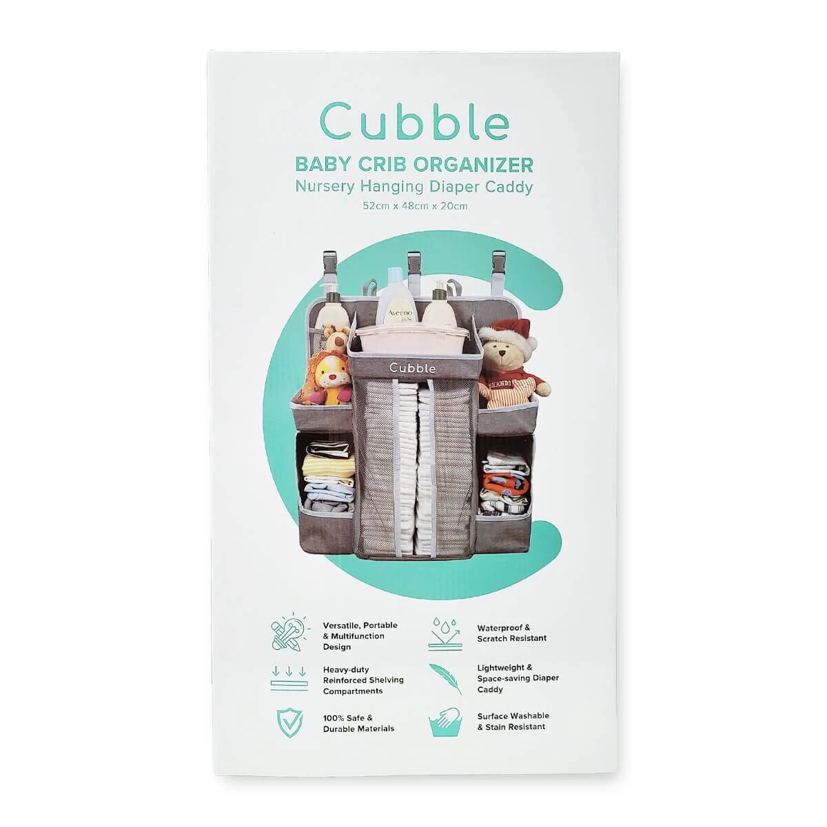 Cubble baby crib organizer is made from durable 300D PVC polyester and quality mesh. The versatile design allows the organizer to be hang on baby cribs/cots, walls, changing tables, car seats, doors and more.
