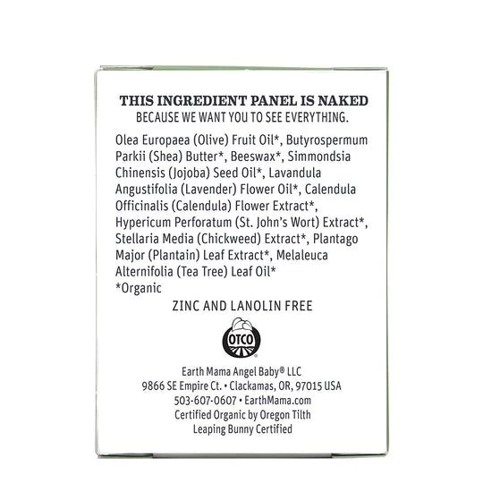 Organic Olea Europaea (Olive) Fruit Oil, Organic Butyrospermum Parkii (Shea) Butter, Organic Beeswax, Organic Simmondsia Chinensis (Jojoba) Seed Oil, Organic Lavandula Angustifolia (Lavender) Flower Oil, Organic Calendula Officinalis (Calendula) Flower Extract, Organic Hypericum Perforatum (St. John’s Wort) Extract, Organic Stellaria Media (Chickweed) Extract, Organic Plantago Major (Plantain) Extract, Organic Melaleuca Alternifolia (Tea Tree) Leaf Oil