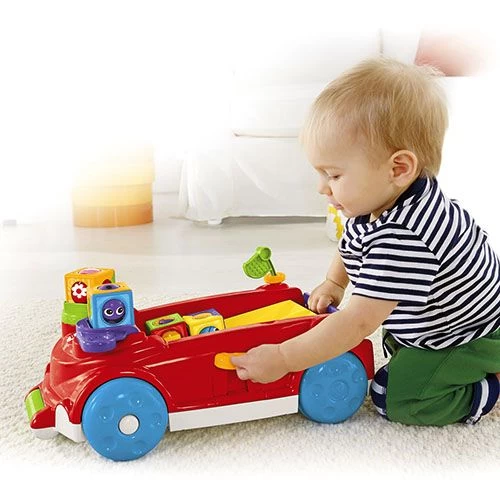 – Baby can press the lever for fun music and sounds as the roller blocks race back & forth! Flip the tailgate down to send the blocks racin’ out the back for baby to chase!