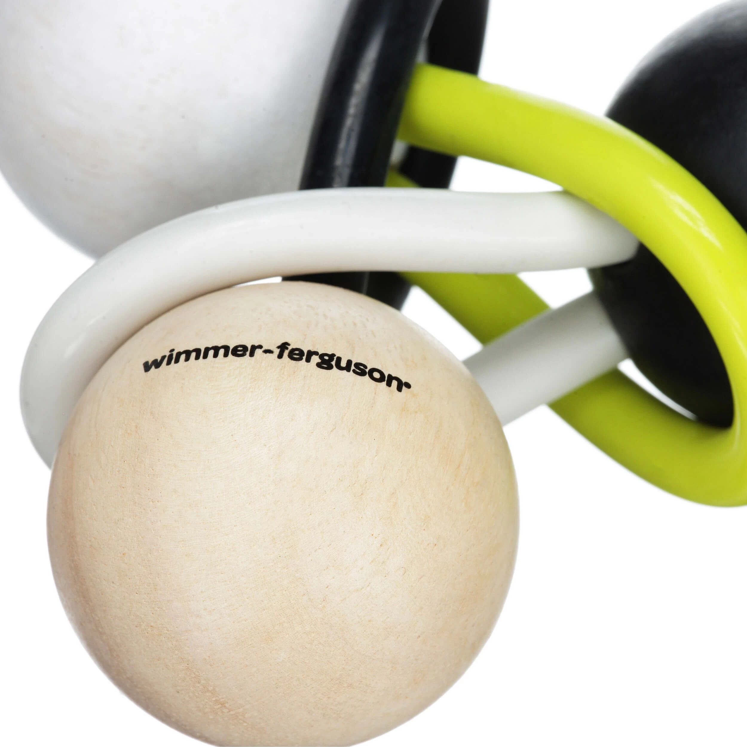 Our Wimmer-Ferguson Loopsy teether and clutching toy borrows on the significance of black and white contrast in helping visual development. Three wooden beads are intertwined with soft, pliable BPA-free loops for teething or gumming babies. These wooden clutching beads are designed for tiny hands to reach for, grab, pull, twist, and gum on, engaging their gross motor skills, and finding comfort during teething time. From our award winning Wimmer-Ferguson infant toy collection – the original innovator of black and white developmental baby toys.