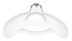 -Handle the nipple shield by the rim. Turn the nipple shield inside-out halfway. Place the nipple shield over the breast with the nipple centered inside the nipple portion of the shield. Then flip the shield right side out, enclosing as much of the nipple as possible. If using the Contact™ nipple shield, position the open section where the baby’s nose will contact the breast.