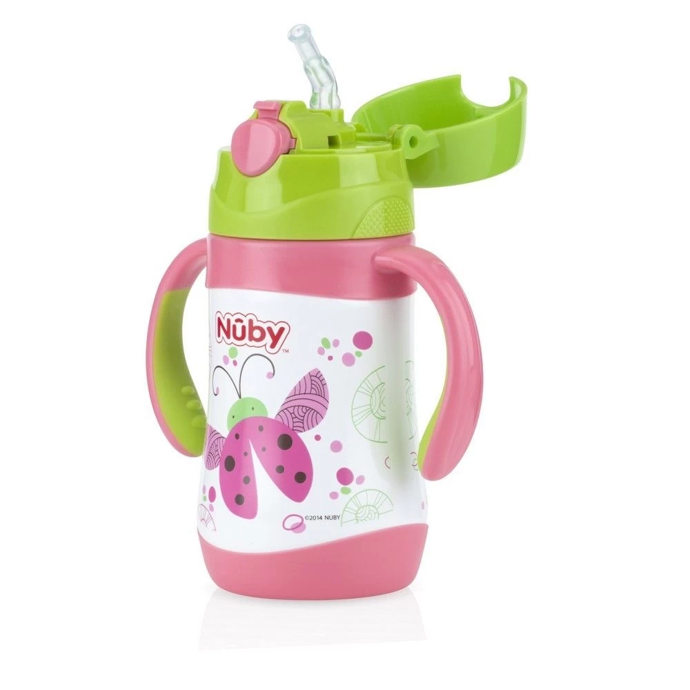 Nûby new Clik-it™ range of cups offers leak-proof technology that you can see and hear so moms and dads won’t have to worry about spills and leaks when cap is closed! The NEW No-Spill™ Stainless Steel Insulated Cup with its colorful two-in-one cup design not only keeps liquid warm or cool; it also helps protect furniture from a “sweating” cup. This cup features a soft silicone straw, which is gentle to child’s tender gums and emerging teeth. The soft silicone straw is covered by an easy-to-use flip-top cap. This uniquely designed feature protects the straw from contamination when not in use. Great for travel and short trips! Flip-cap keeps straw sanitary and clean. When child is ready to use the cup, push the button on front of the cup and clip the cap back to expose the straw. The leal-resistant cup dispenses a variety of liquids, ranging in consistency from fruit juices to milk and water. All Nûby™ products are made of safe, durable materials.