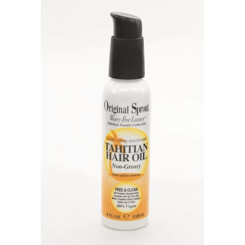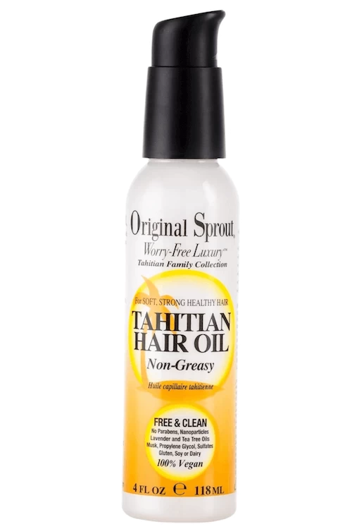 Original Sprout Tahitian Hair Oil’s gentle formula is infused with coconut oil and linseed oil, to lock in moisture, control breakage and prevent frizz. To use, apply a dime-sized amount onto ends of hair. For optimal moisture, use as an overnight treatment, or to protect hair from the elements when at the beach or pool. Also great for use on extra dry skin.