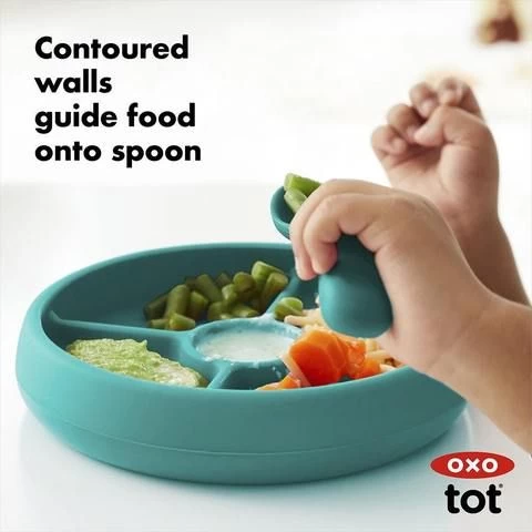 This Silicone Divided Plate helps toddlers learn to feed themselves while keeping foods separated. Made entirely of BPA-free silicone, the divided plate features a weighted base that helps prevent accidental tipping or sliding. Tantrum-proof construction won’t crack or chip, no matter how much your tot tries. The high walls of the plate curve inward to help toddlers successfully scoop food into spoons, while the center compartment is perfect for dips. This divided plate is designed specifically for little hands to grasp with ease.