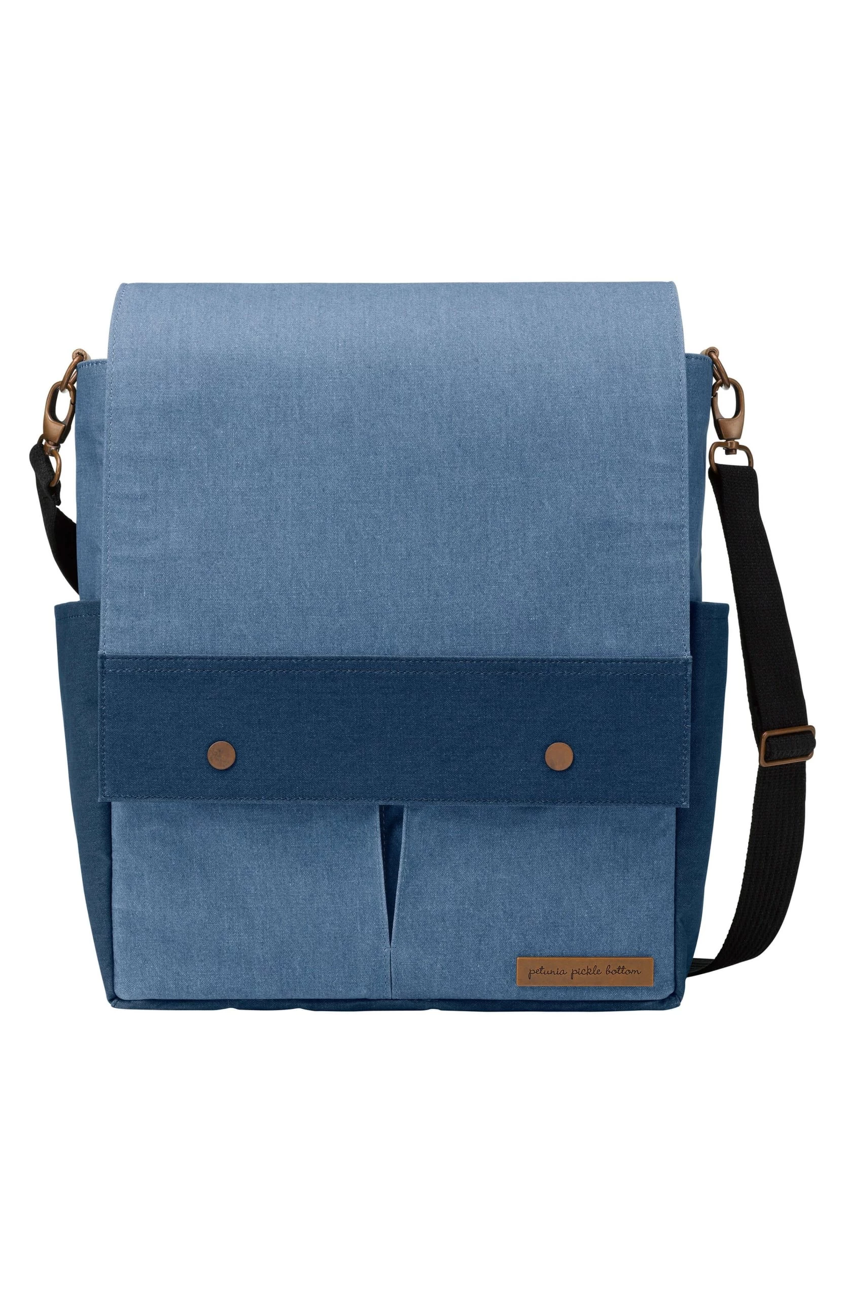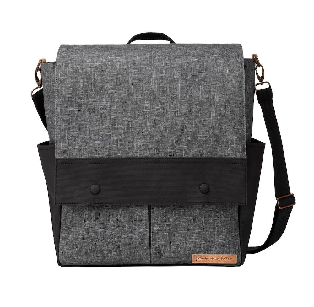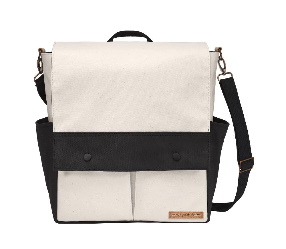 This coated cotton canvas diaper bag has woven backpack straps, grab handle and detachable cross-body strap