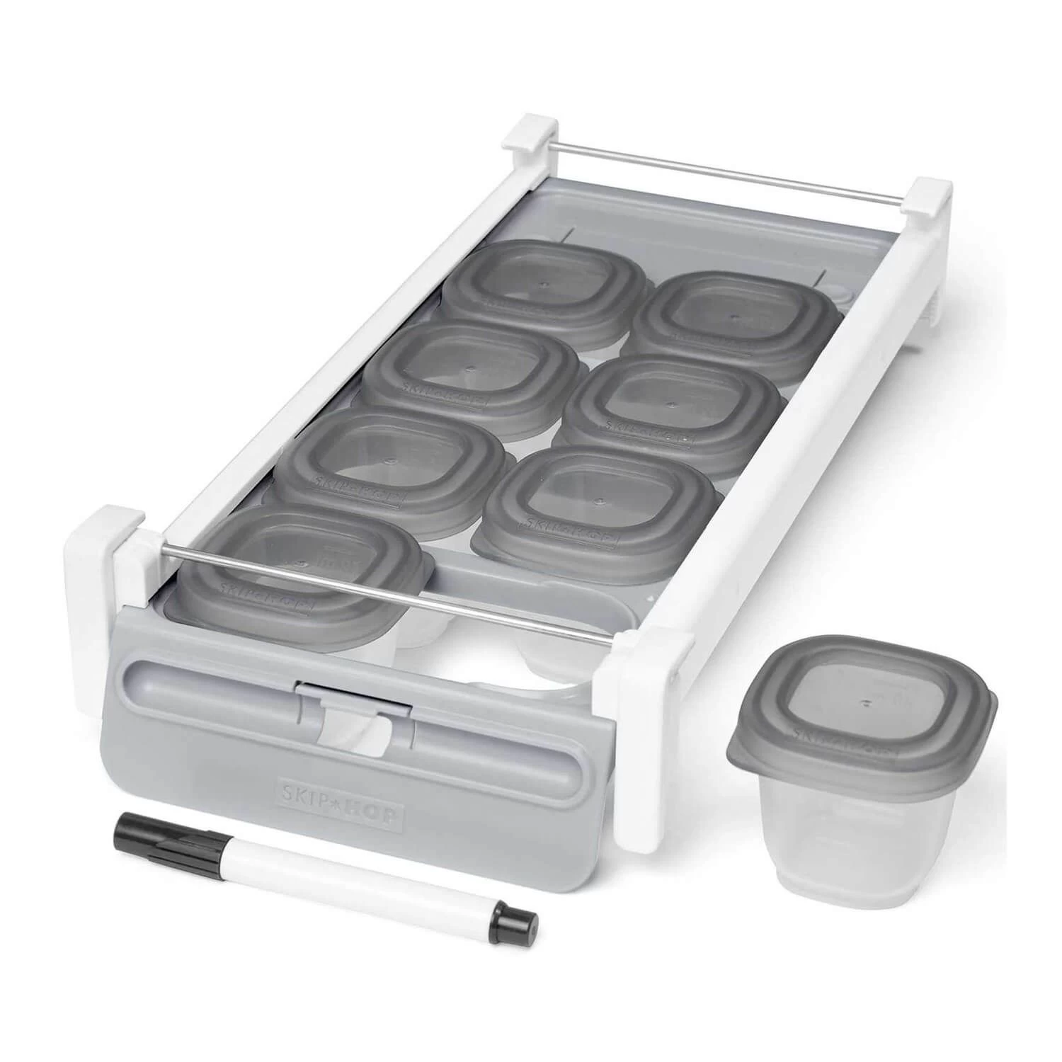 – Clip-on sliding tray for fridge or freezer with 8 (2 oz.) baby food storage containers with lids, dry-erase marker to mark down date