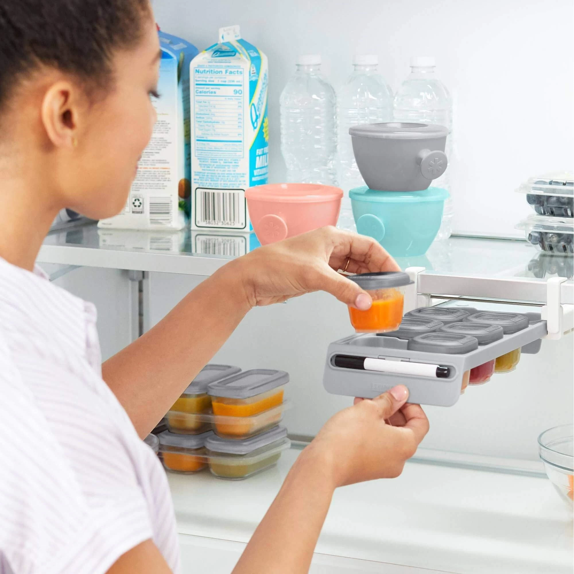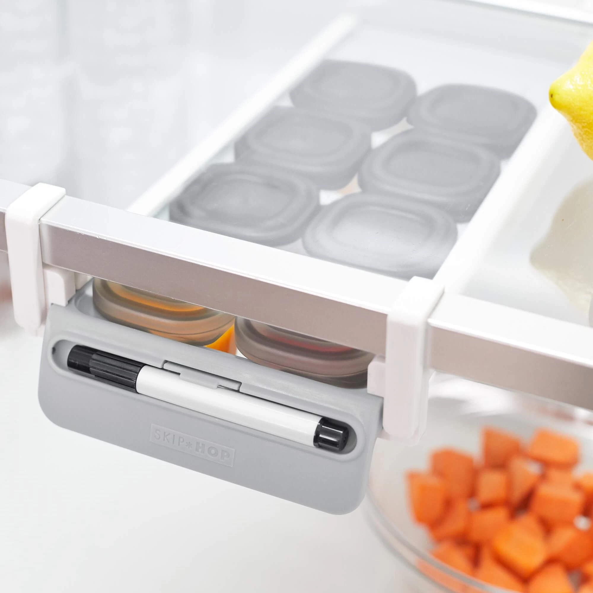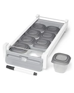 A space-saving solution for storing fresh baby food in your fridge or freezer, our sliding tray set keeps you organized and ready to go at feeding time. Easy to clip underneath your fridge or freezer shelf, the sliding design includes a dry-erase marker for labeling plus eight containers with lids for on-the-go convenience.