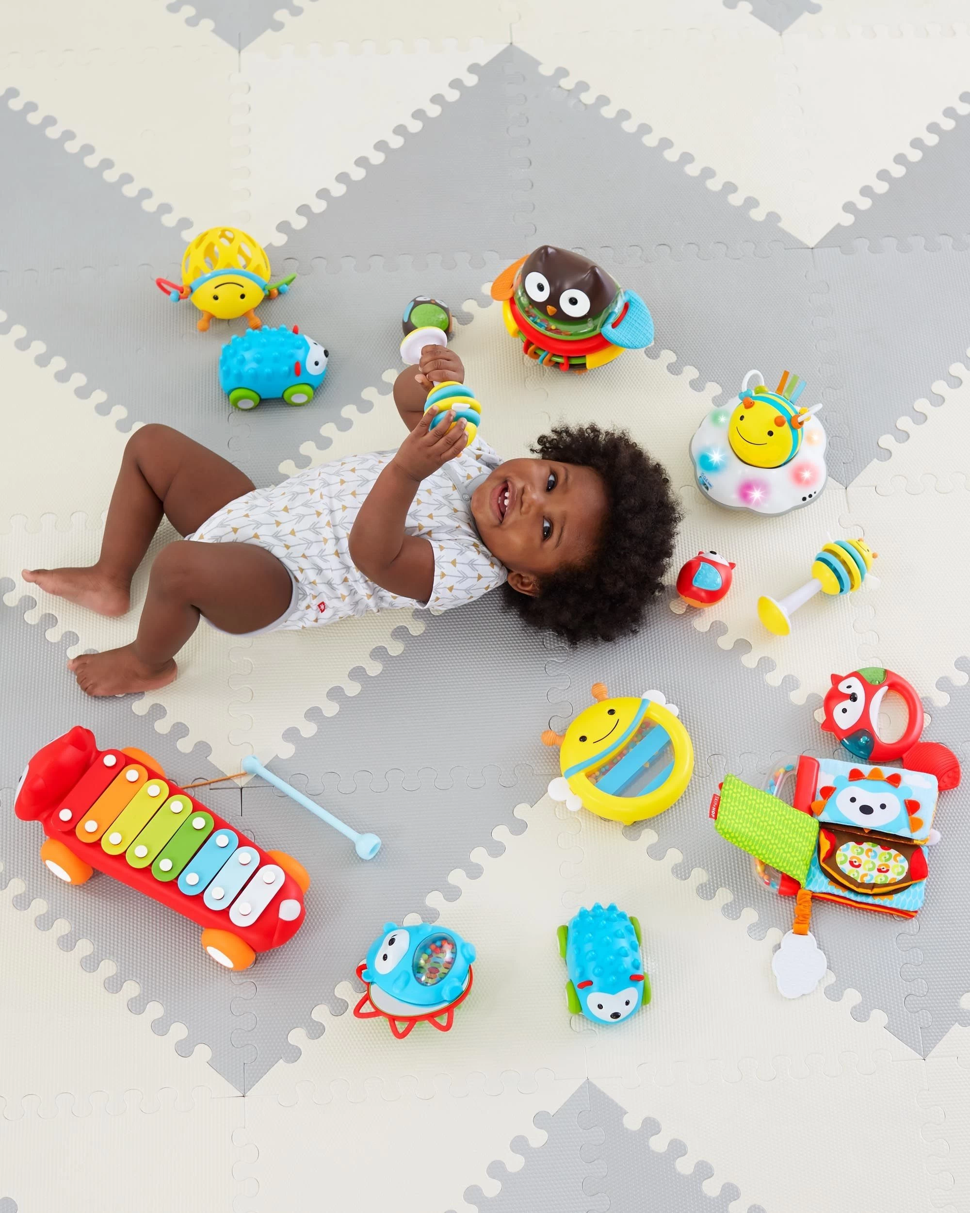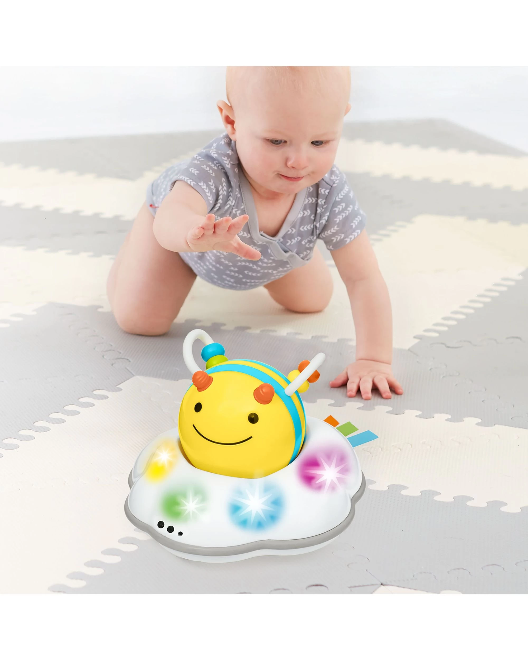 If you’re looking for toys to help baby crawl, you won’t “bee” disappointed with this one! Designed to grow with your baby through three stages, our motorized crawl toy challenges and encourages little ones learning to crawl with colorful lights, energetic tunes and sweet buzzing sounds.