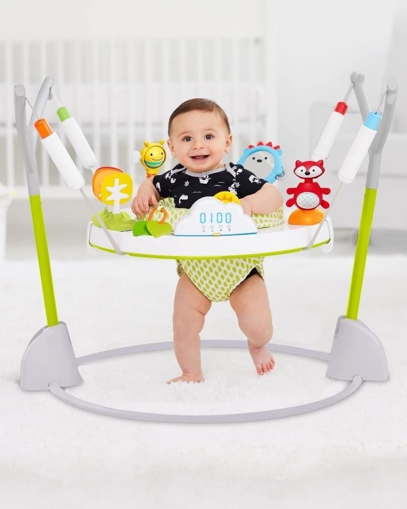 With a light-up cloud bounce counter to track baby’s jumps, our jumper rewards baby with lights and music and breaks into applause at 100-jump milestones! It features a 360-degree rotating seat so baby can sit, swivel and bounce for maximum exploration. Clip-on, movable toys encourage development and allow for customized play. When playtime is done, easily fold our baby jumper flat for storage and transport. Great for 4 months+.