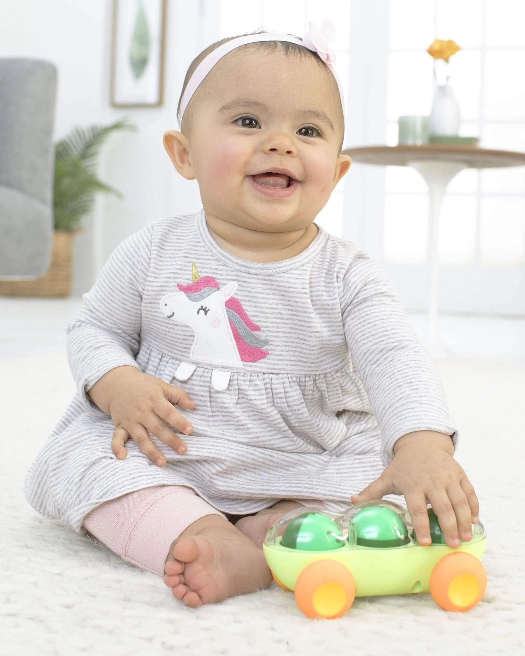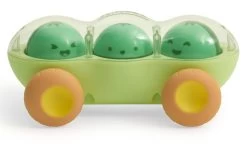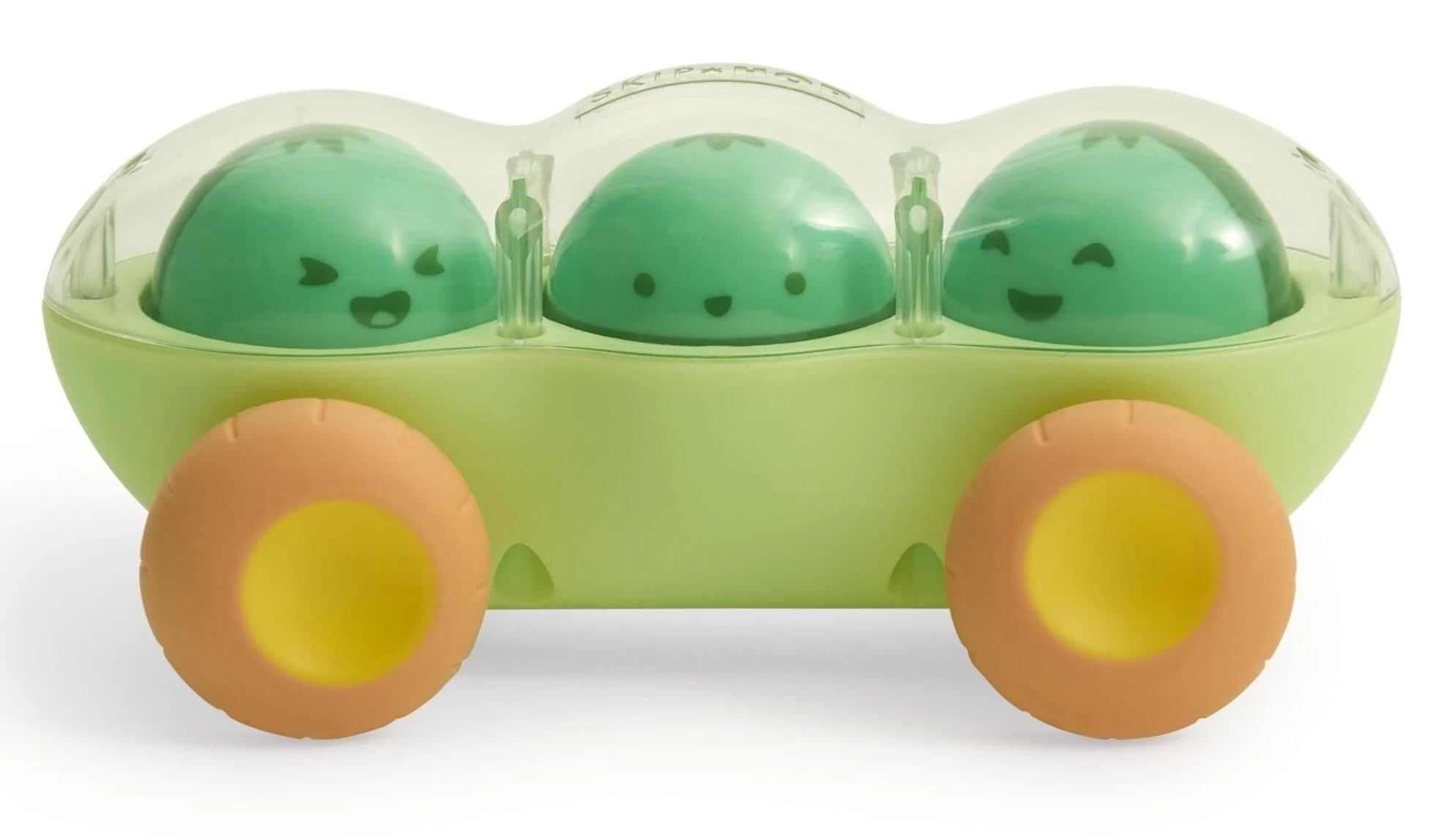 A push-along pod car with three bobbing peas inside. Baby’s first car is ready to roll! Three peas in a pod make a cute squad as they spin, bob and glide when little hands push them along.