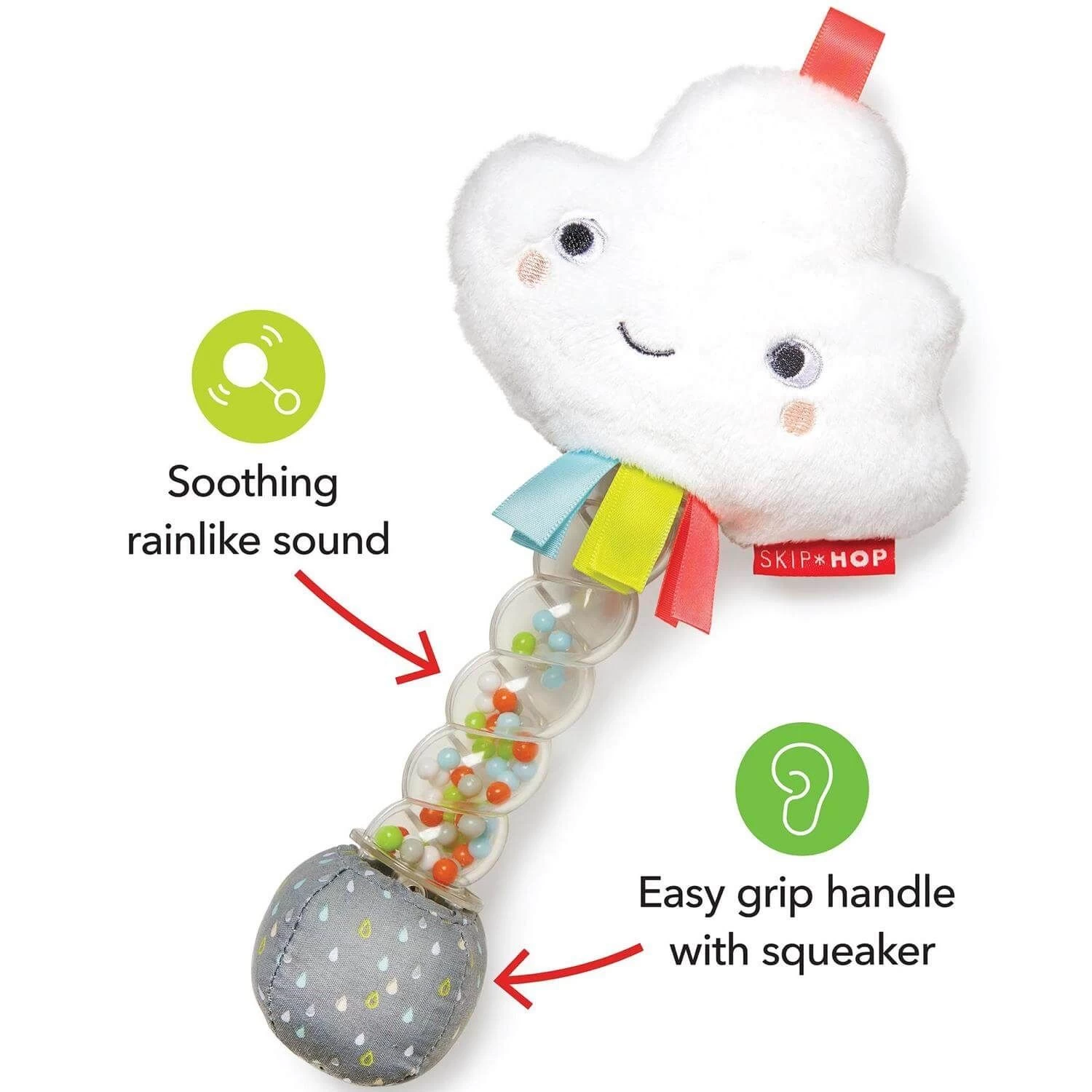 Easy for little hands to grab and shake, our adorable rainstick rattle makes soothing pitter-patter raindrop sounds little ones will love. With a plush cloud and colorful ribbons for tactile exploration, it also features a fun raindrop squeaker ball at the handle base for baby to discover. Coordinates with the Silver Lining Cloud collection.
