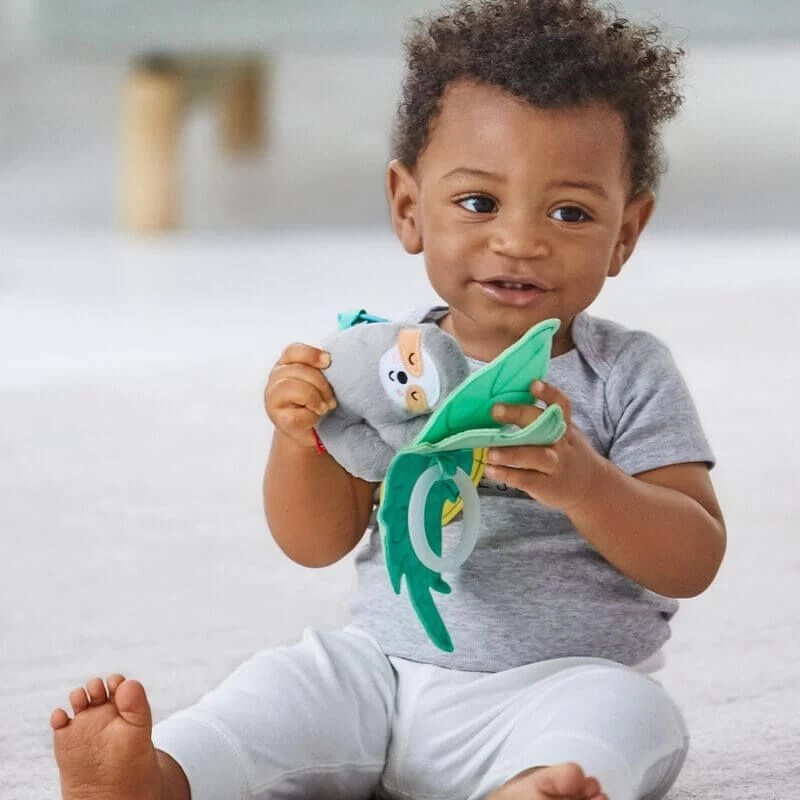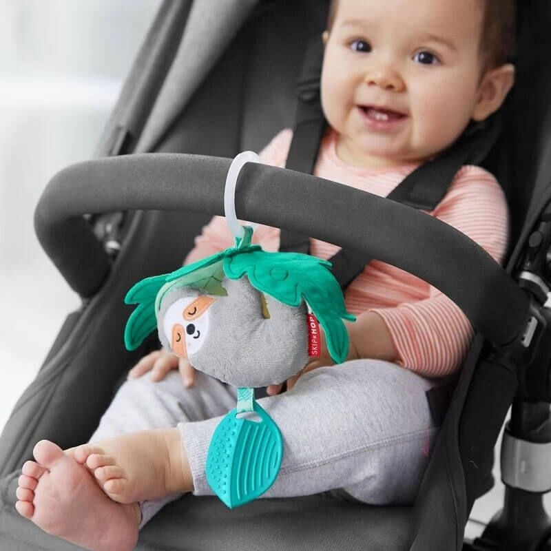 Skip Hop Tropical Paradise Vibrating Jitter Stroller Toy & Teether is a sloth stroller toy that vibrates and shakes when the leaf-shaped teether toy is pulled. With a plush, sleepy sloth playing peek-a-boo in the leaves. Fun at home or on the go— just attach it to your stroller and keep baby busy and happy as you stroll.