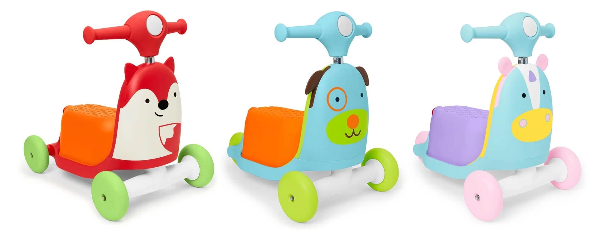 Skip Hop Zoo 3-In-1 Ride On Toy is a ride-on walker that is designed to grow with your little one throughout the three stages. Stage one, designed for early walkers, motivates little ones to push and pull in wagon mode—a great spot for favorite toys, too. At stage two, the wagon’s storage tub converts to a seat for ride-on mode. Stage three, just remove the seat, pull up the adjustable handle for your toddler, hop on the scooter and take it for a spin!