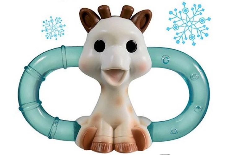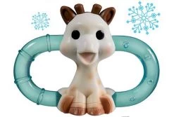 The Double Ice Bite teething ring has 2 water filled rings which can be chilled in the fridge to help soothe sore gums. The soft and chewy rings also double as handles making it easy for baby to hold. Both rings also have a textured surface to gently massage baby’s gums, with the reassuring face of Sophie the Giraffe to comfort baby. Suitable from 3 months onwards.