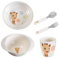 Sophie the giraffe meal-time set contains 4 accessories in each design: – 1 rounded plate with a design that your baby will discover as they eat. – 1 bowl with 2 handles to grab without getting burnt. – 1 cup for drinking – 2 pieces of learning cutlery, specially designed for a baby’s little hands.