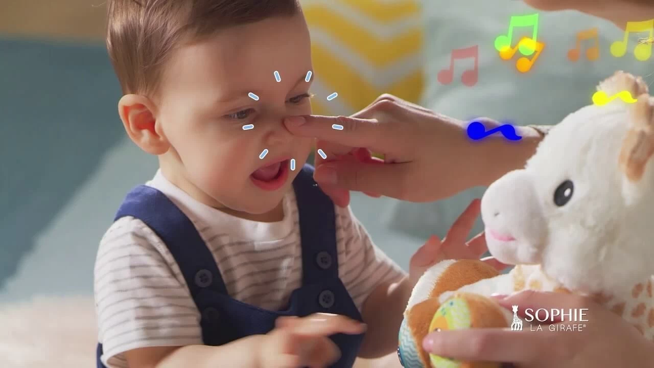 Just touch the two sensory sensors on Sophie’s hoof stimultaneously with the skin to trigger automatically notes of music and turn on the light of the star!