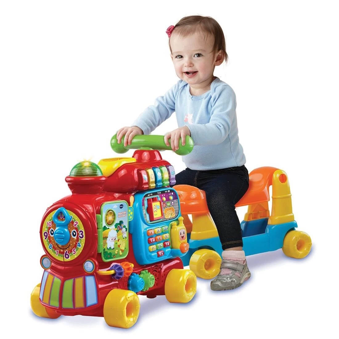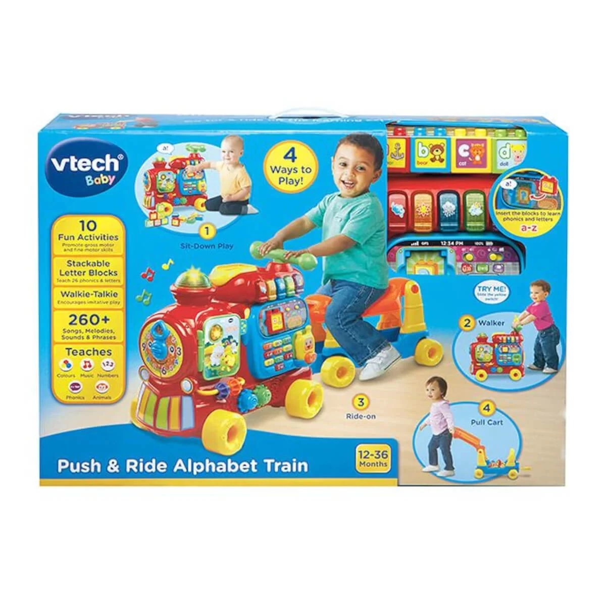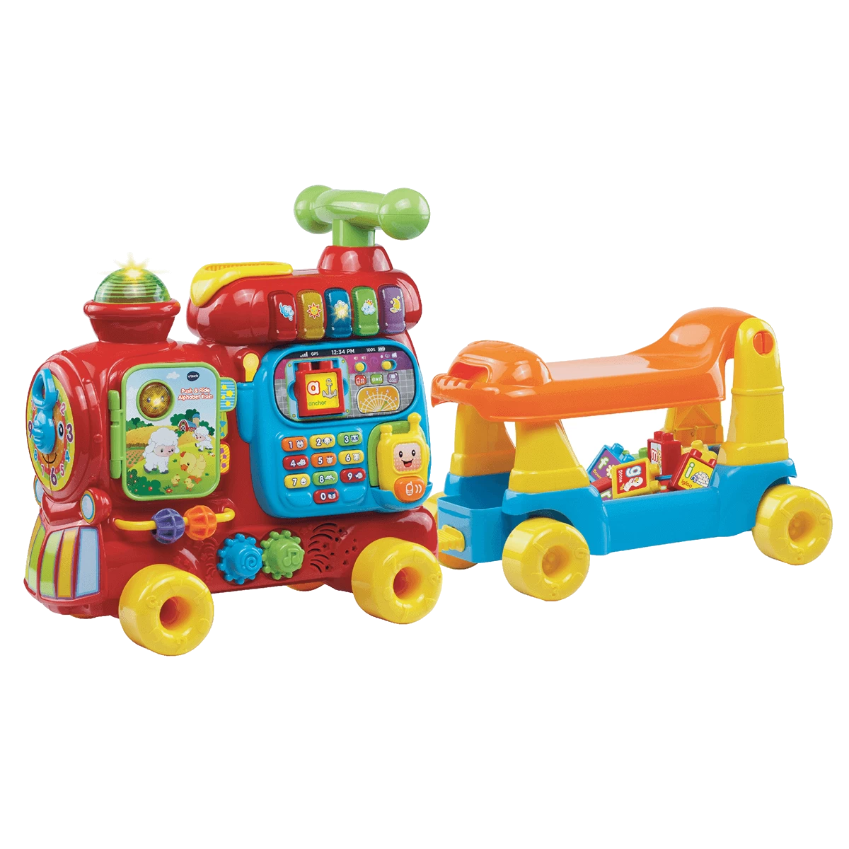 Make tracks with the Vtech Push and Ride Alphabet Train. The colorful train and carriage teaches little ones letters, numbers, colours, songs, stories and more! Featuring 13 double-sided chunky letter blocks, a book with 6 flip-over pages, 5 colourful number buttons and follow-me-lights, this grow with me train is a perfect way to promote independent play for children. The fun elephant character will encourage your child to learn more with fun questions. Your baby can use the train for sit-down play, to push along as a walker, or with the carriage as a ride-on toy!